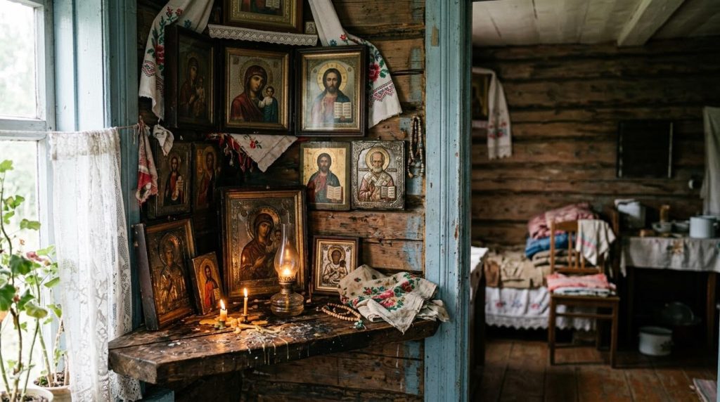 Эта традиция любопытна еще и тем, что в ней можно увидеть влияние церковной архитектуры на повседневный быт. Домашний иконостас, конечно, не повторял храмовый буквально, но сам принцип иерархии образов — центральный Спаситель, Богородица, святые покровители семьи — уже отсылал к храмовому сознанию, где святыня организует пространство и задает ему смысл.